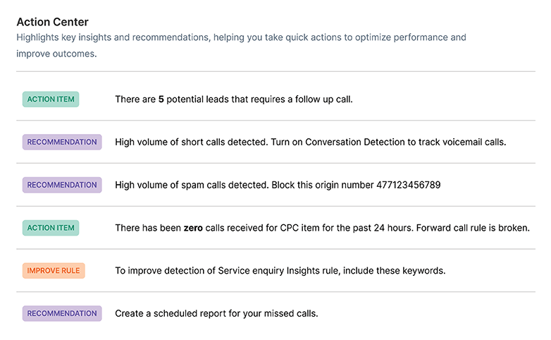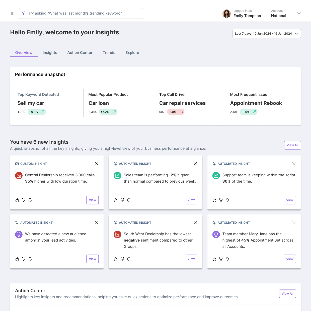 Gain a holistic view of your call performance, automated insights, and actionable recommendations—streamlining decision-making and driving continuous improvement across your organization.