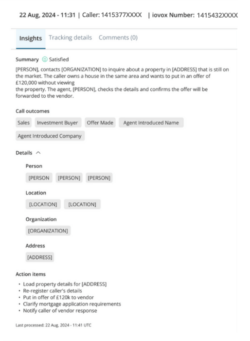 - 2. iovox procesará sus llamadas a través de su herramienta de análisis Insights. Obtenga una visión integral del rendimiento de sus llamadas, insights automatizados y recomendaciones accionables—agilizando la toma de decisiones e impulsando la mejora continua en toda su organización.
